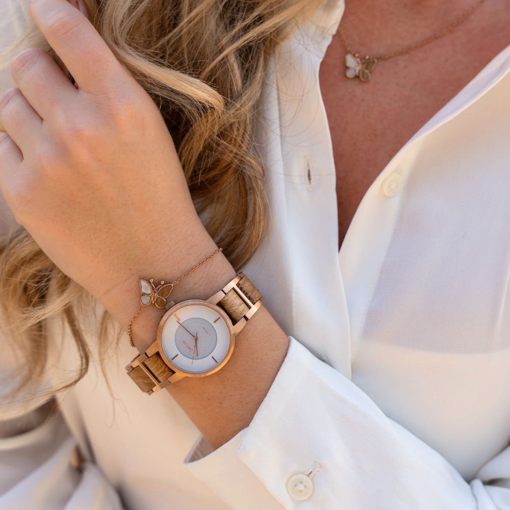 Zur Ergänzung der Uhr verleiht das Schmetterling-Schmuckset eine sanfte, elegante Note. Das Set besteht aus einer passenden Halskette und einem Armband, beide mit weißen Marmor- und Eichenholzdetails, die das Licht einfangen, ohne den Look zu überladen. Ihr warmer Roségold-Finish harmoniert perfekt mit der Kombination aus roségoldenem Edelstahl und Eichenholz der Freiberg Solar – ein stilvoll abgestimmtes Ensemble für den Alltag und besondere Anlässe.