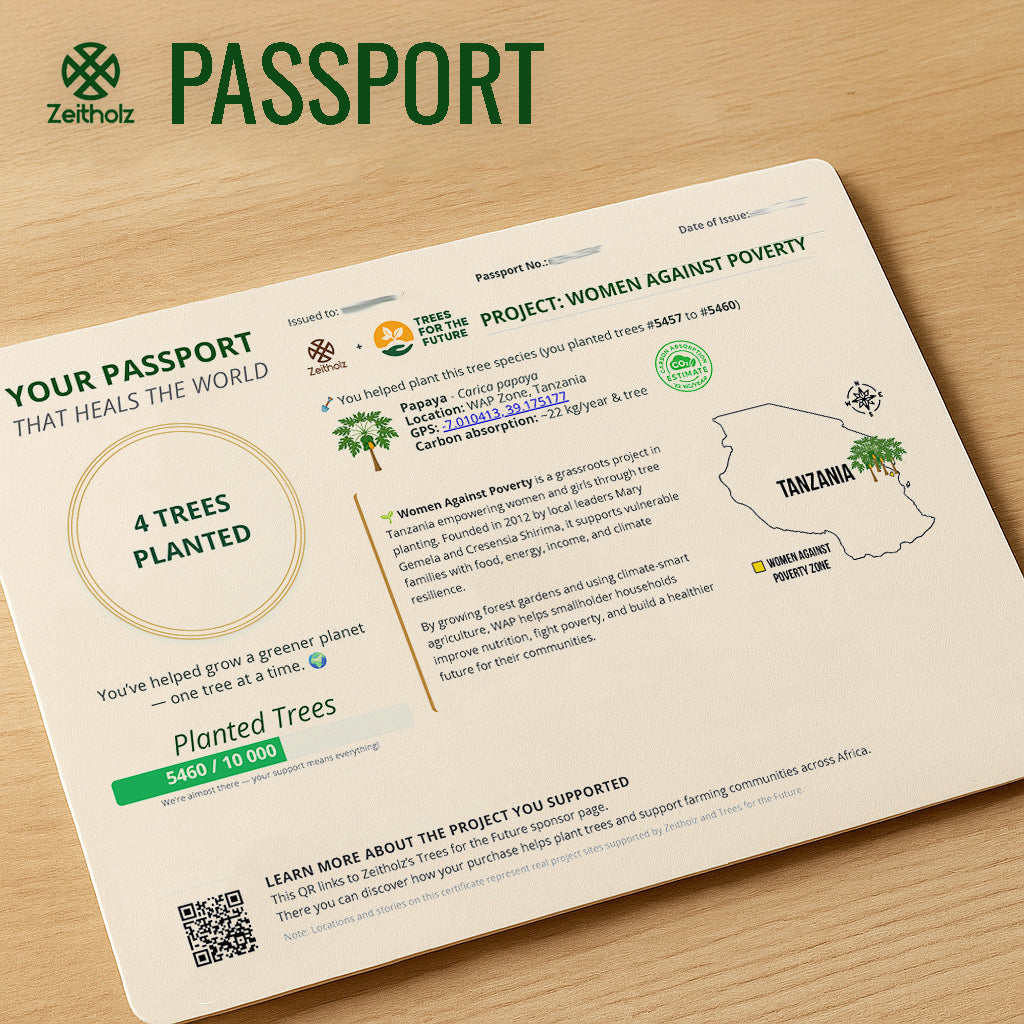 Ogni ordine include il tuo Passaporto dell'albero – un certificato personalizzato che mostra dove è stato piantato il tuo albero (o i tuoi alberi), la specie e l’impatto reale che hai contribuito a creare.